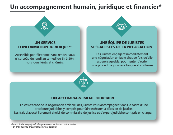 Voici un exemple d’offre sur mesure créée pour les adhérents d’une mutuelle. Elle couvre les risques de litiges liés à la santé comme :