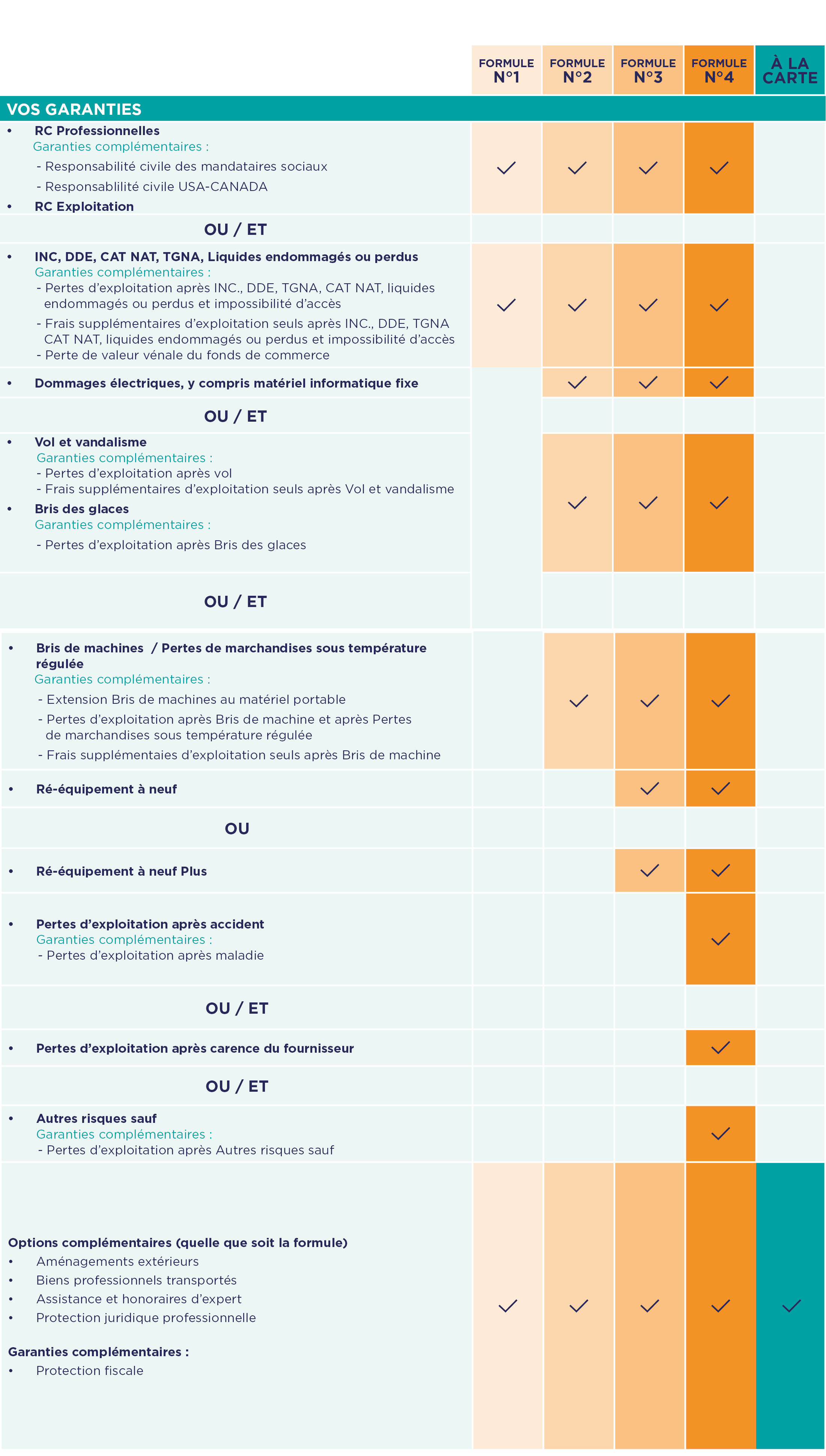 La formule n°1 inclut les garanties Responsabilité Civile liée à l’activité professionnelle (Responsabilité Civile des mandataires sociaux en option) et Incendie, dégâts des eaux, tempête, grêle, neige, avalanche, catastrophes naturelles (Pertes d’exploitation en extension).